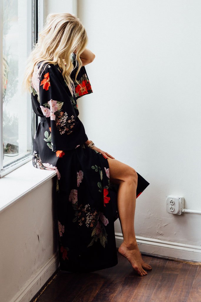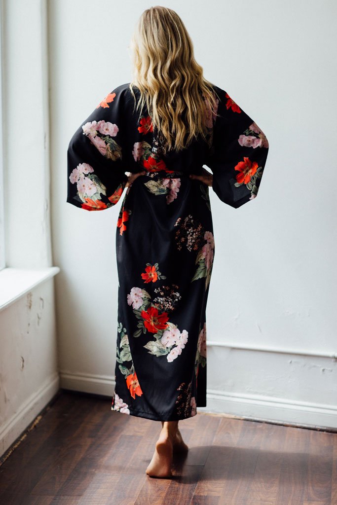 The 'Audrey' robe is a kimono floor-length style with an interior and exterior tie. Feel like royalty all day in this luxurious style. Pair with the 'Luella' cami and 'Lola' short for a complete look or mix and match with our silk and knit sets!